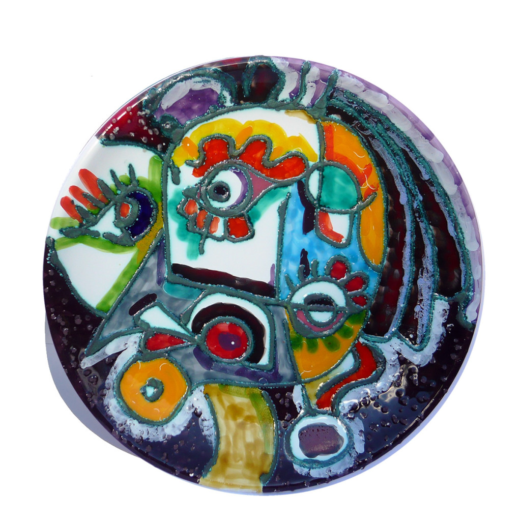piatto tondo murale raffigurante volto di donna realizzato e decorato a mano con smalti policromi e inserti in piombo