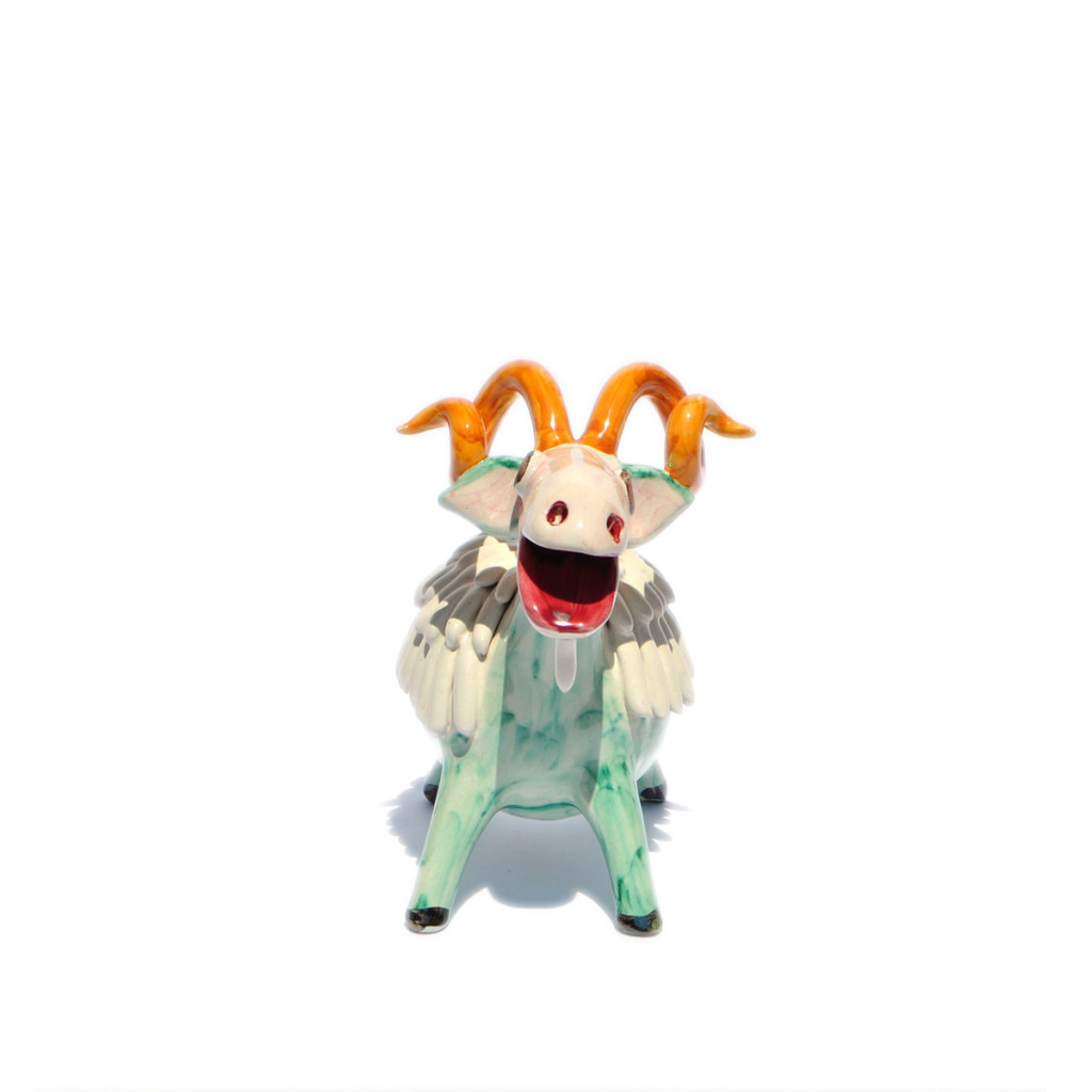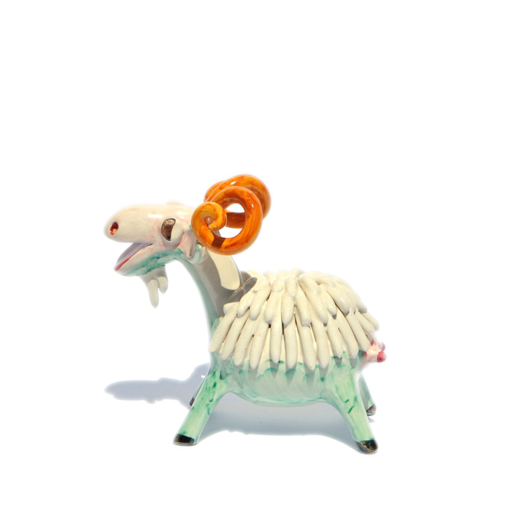 statuetta tridimensionale raffigurante la capra, interamente realizzata a mano con smalto e colori policromi.