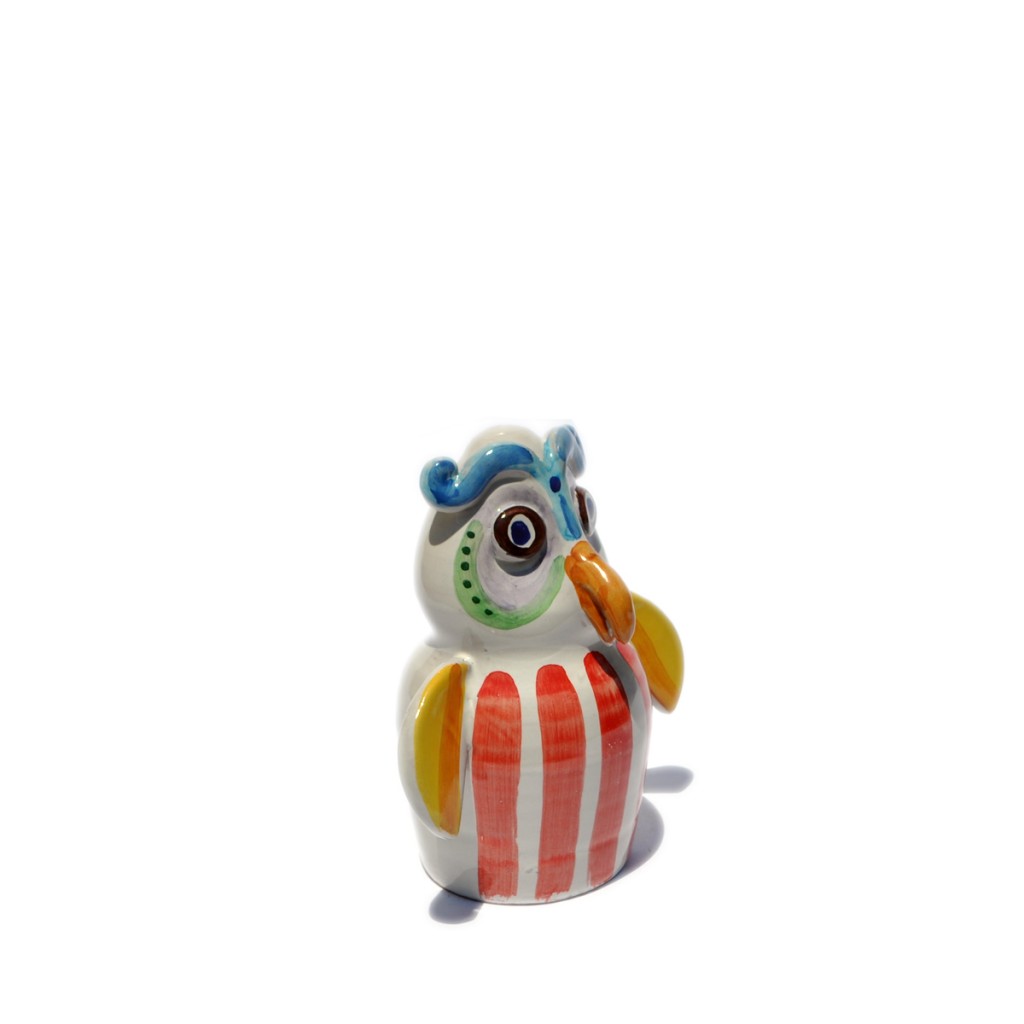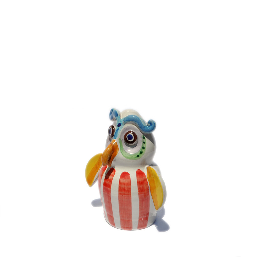 statuetta tridimensionale raffigurante il gufo, interamente realizzata a mano con smalto e colori policromi.