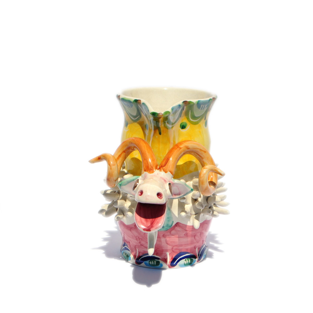 Boccale a forma di capra/ariete interamente realizzato e decorato a mano con smalto e colori policromi. Uso decorativo e domestico.