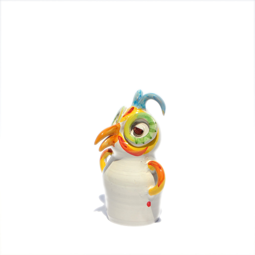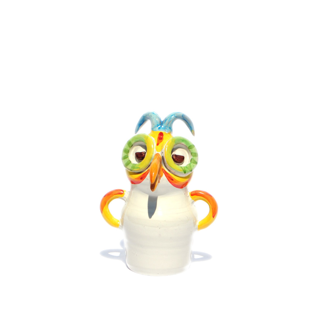 statuetta tridimensionale raffigurante il gufo, interamente realizzata a mano con smalto e colori policromi.