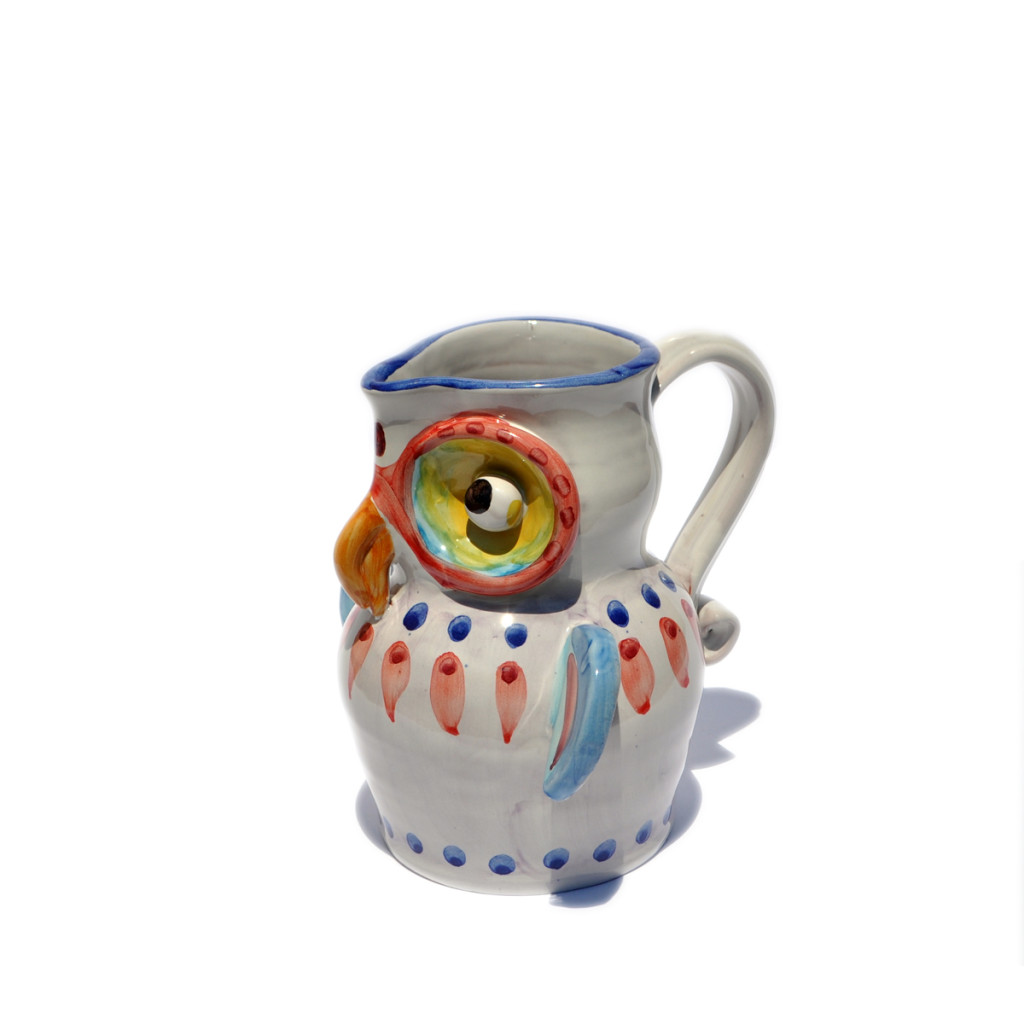 statuetta tridimensionale raffigurante il gufo a forma di brocca, interamente realizzata a mano con smalto e colori policromi.