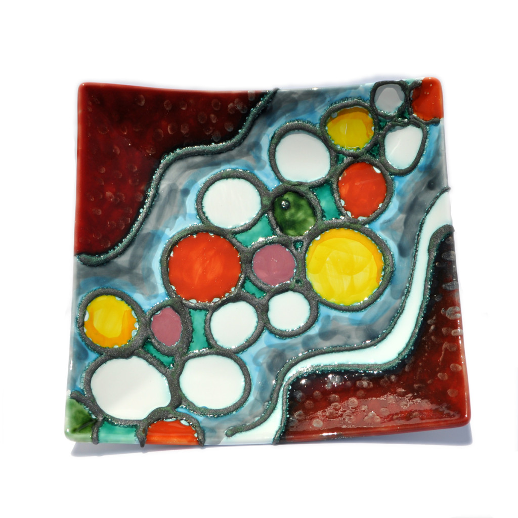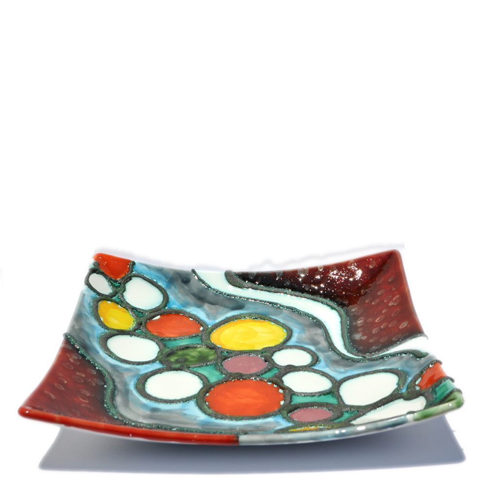 Piatto Quadrato, centro tavola, interamente realizzato e decorato  a mano con smalti policromi e inserti in piombo. Disegni astratti.