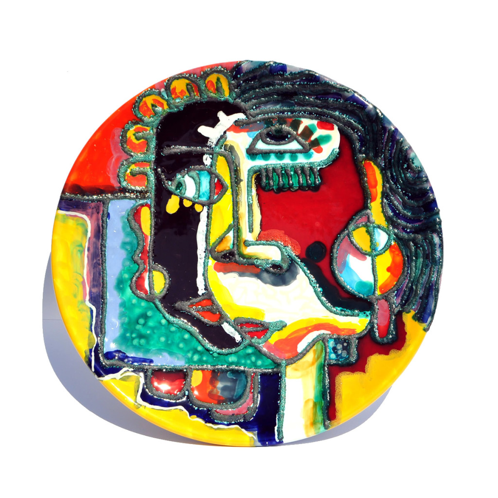 piatto tondo murale raffigurante volto di donna realizzato e decorato a mano con smalti policromi e inserti in piombo