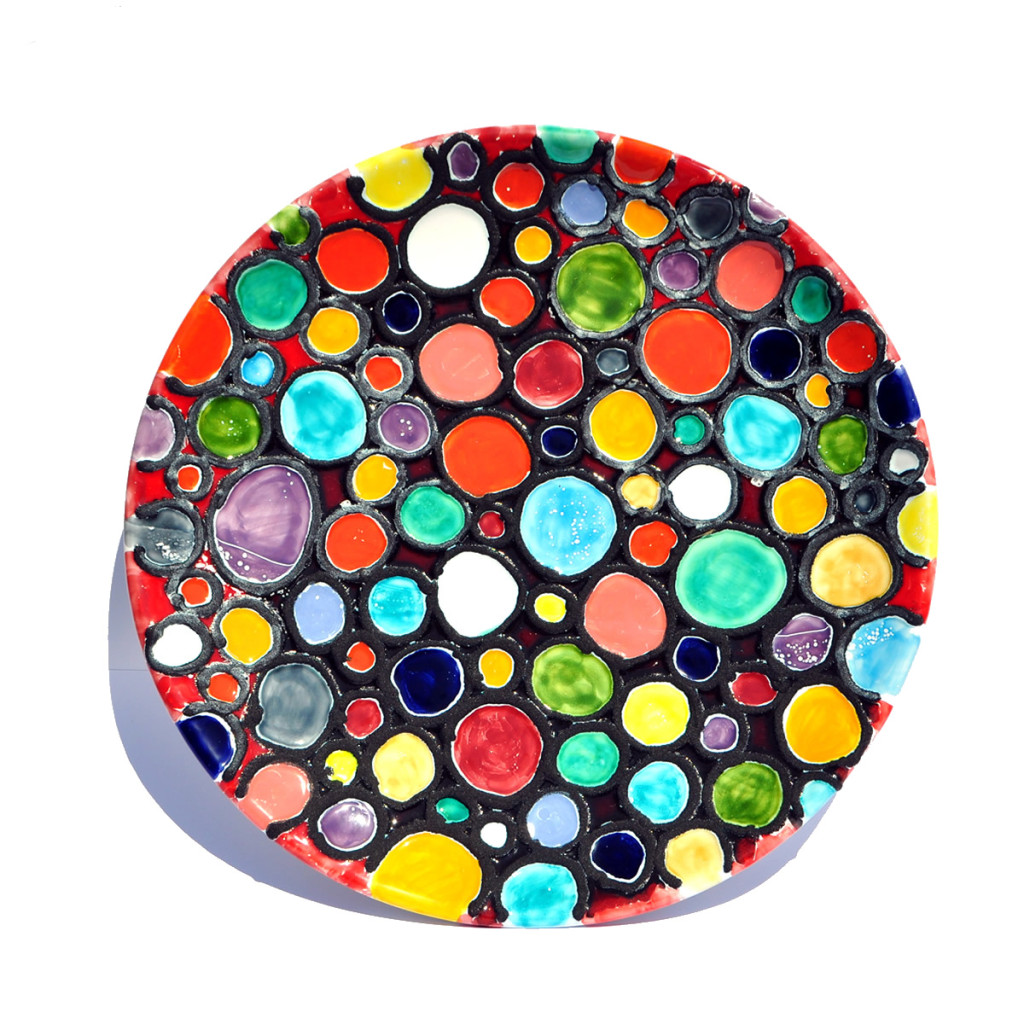 piatto tondo murale con decorazione astratta realizzato e decorato a mano con smalti policromi e inserti in piombo