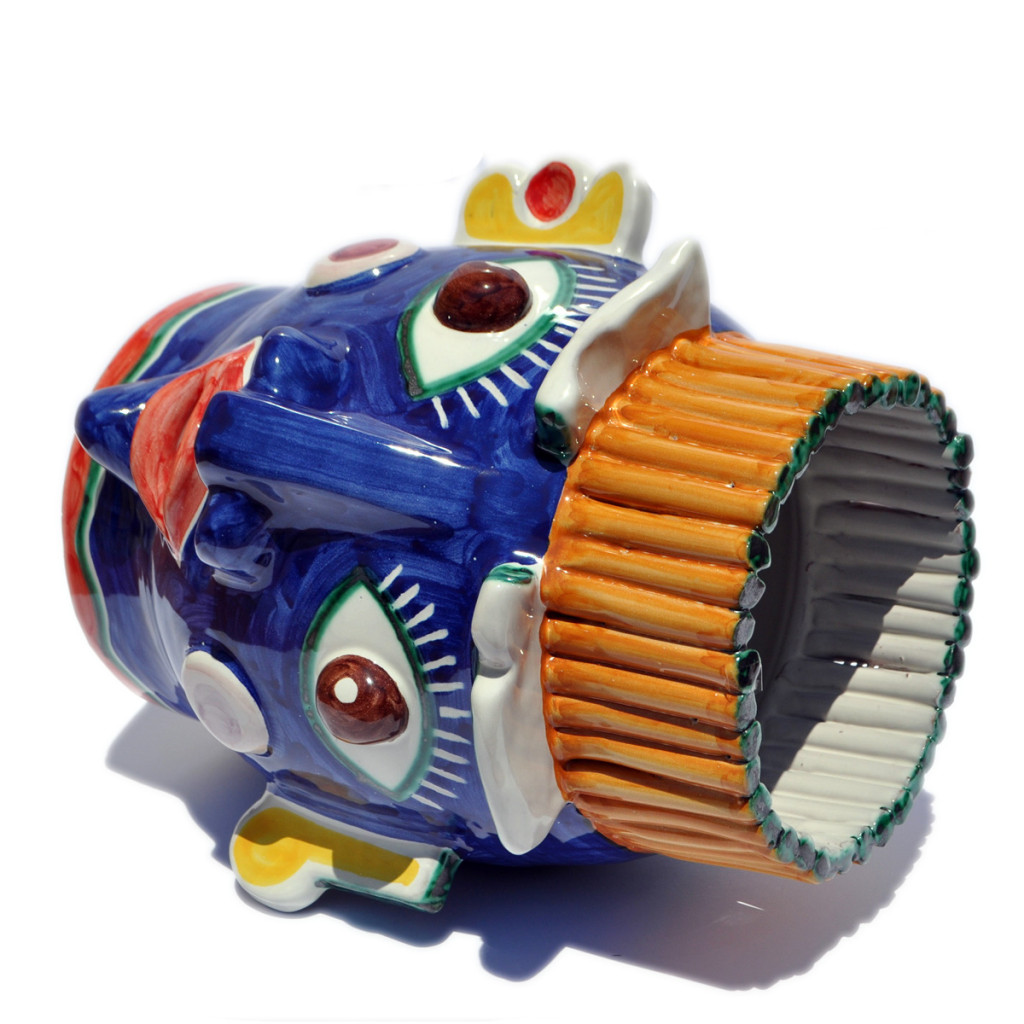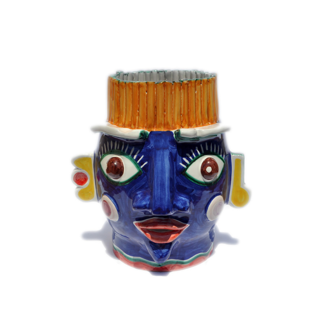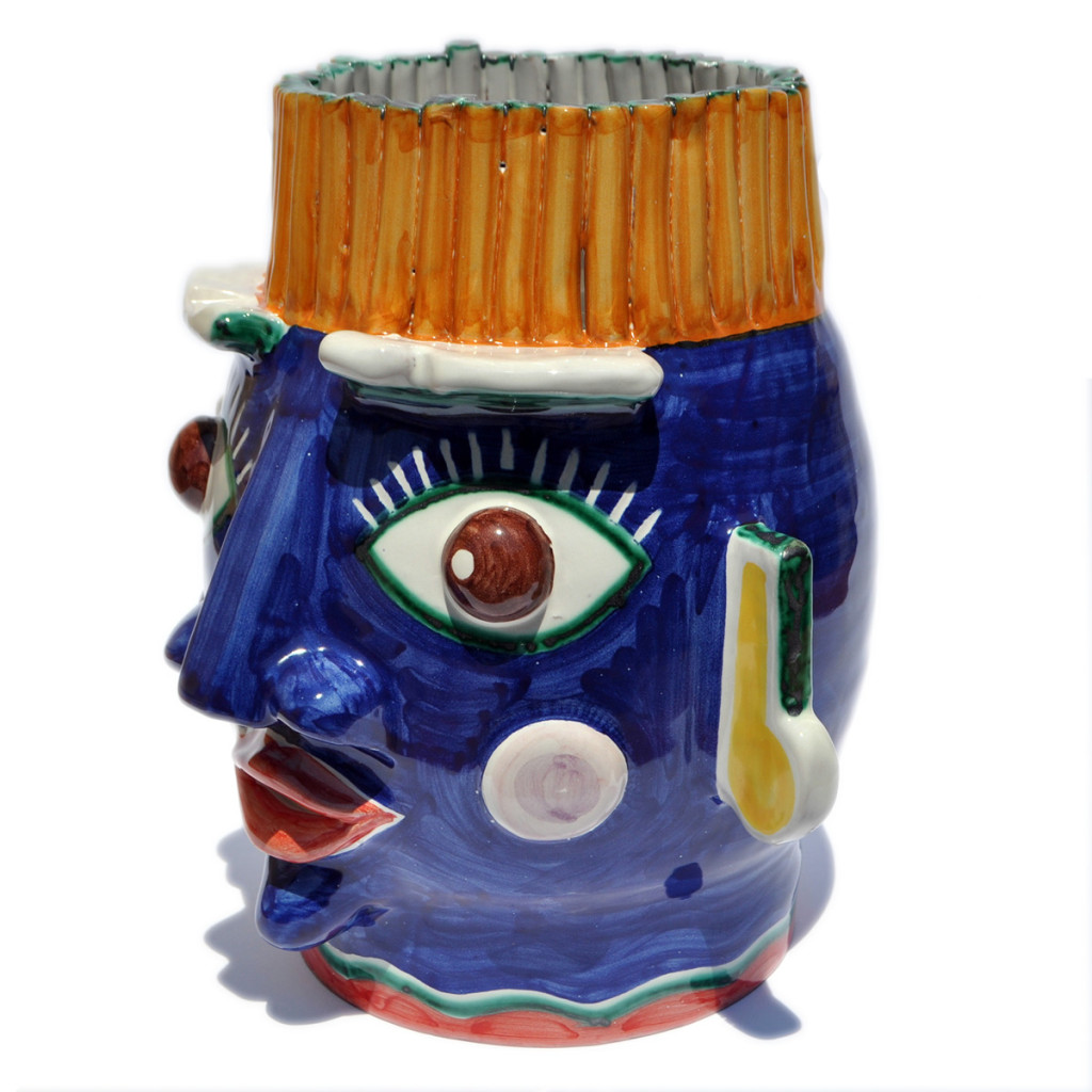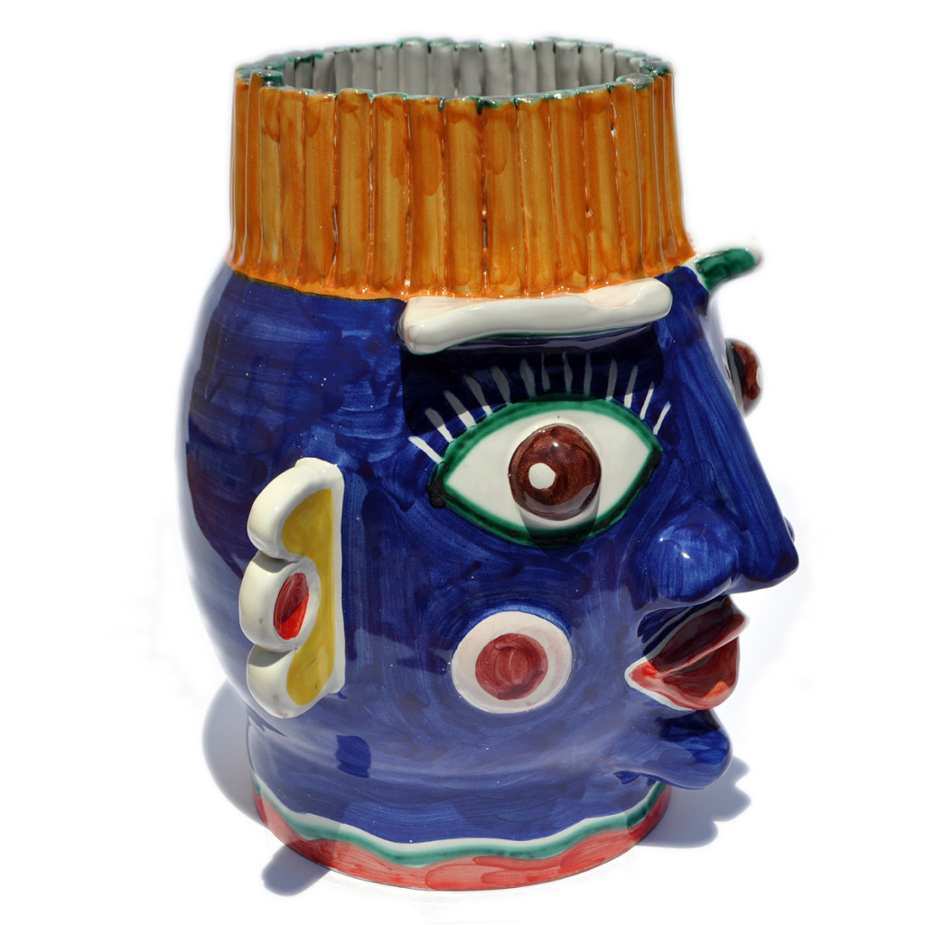 Vaso in ceramica realizzato e decorato a mano con smalto e colori policromi, raffigurante testa di Sabello, antico abitante del Molise. Uso ornamentale