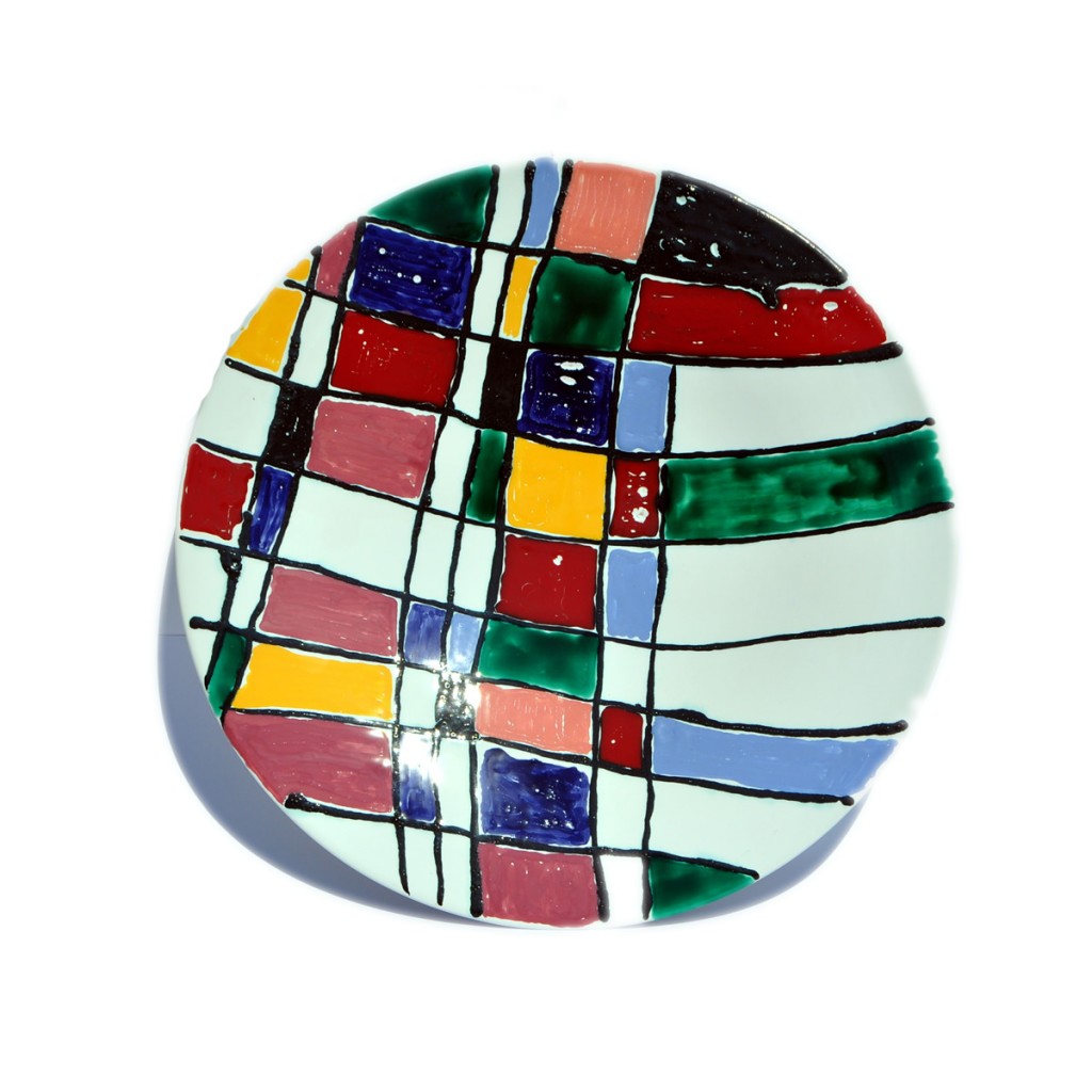 piatto tondo murale con decoro astratto realizzato e decorato a mano con smalti policromi e inserti in piombo