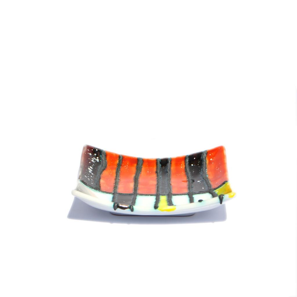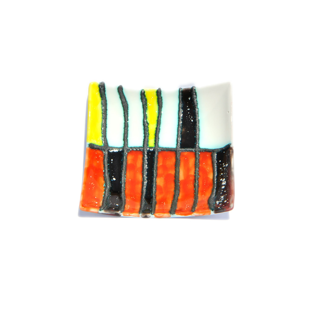 Piatto Quadrato, centro tavola, interamente realizzato e decorato a mano con smalti policromi e inserti in piombo. Disegni astratti.