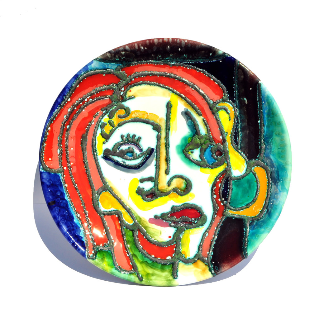 piatto tondo murale raffigurante volto di donna realizzato e decorato a mano con smalti policromi e inserti in piombo